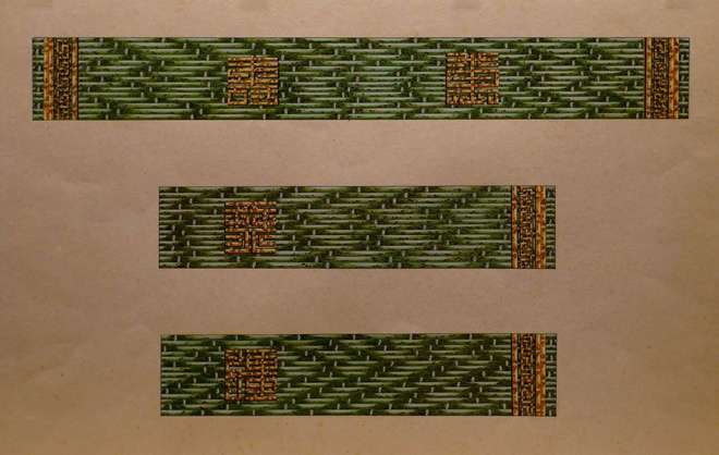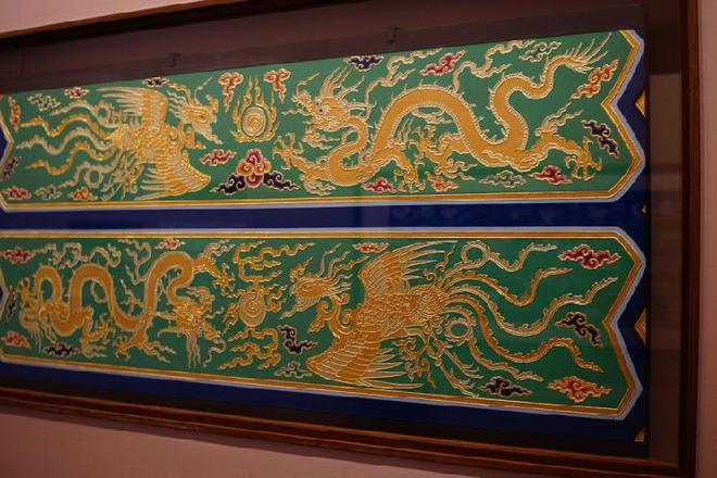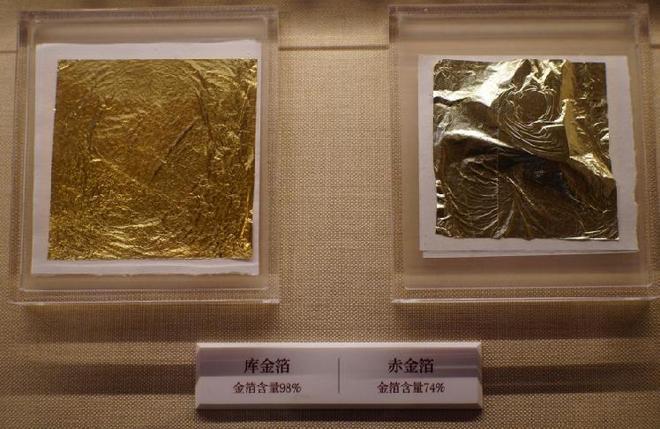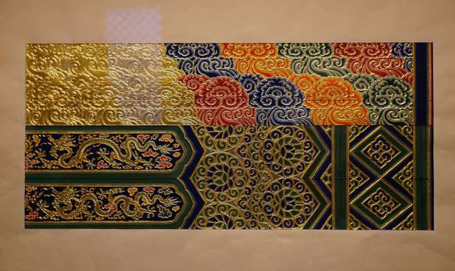 该部分展出的永寿宫内檐西番莲灵芝找头龙凤和玺彩画最突出的特点就是使用了“赤金”和“库金”两种不同含金量的金箔,来丰富纹饰的用金层次,这是清代早中期常用的“两色金”工艺。学者根据清工部《工程做法》记载推测,两色金工艺在贴金箔前采用不同的衬色材料,“赤金”使用彩黄,而“库金”使用的是南片红土。