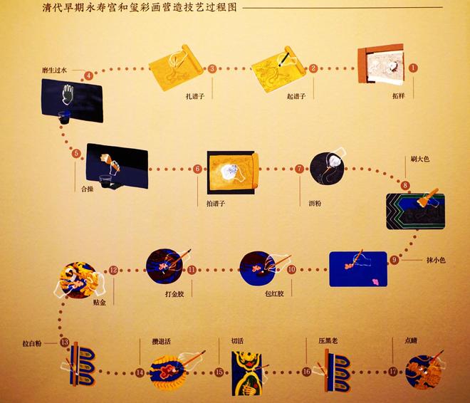 早期彩画工艺以宋代官式彩画中的五彩遍装为代表,绘制工艺大体可分为衬地、衬色、叠晕与剔地四个步骤。到了明清时期,彩画工艺更加复杂,清代官式彩画的工艺水平更是发展到巅峰,采用多种不同的绘制技法,例如,清代早期永寿宫和玺彩画的技法过程就包括了拓样、起谱子、扎谱子等17道工序,工序繁复、用料考究。