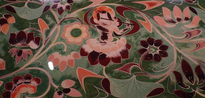 莫高窟第427窟人字批脊枋莲花伎乐童子彩画堪称敦煌隋代“五彩遍装”彩画的经典之作。以大绿为地,图案饰以土红、粉红、浅绿、鹅黄及粉线。以波浪状翻卷枝条贯穿全图,以忍冬叶和荷叶为辅,二方连续的波状构图后来发展为唐宋官式彩画植物花纹的典型构图。