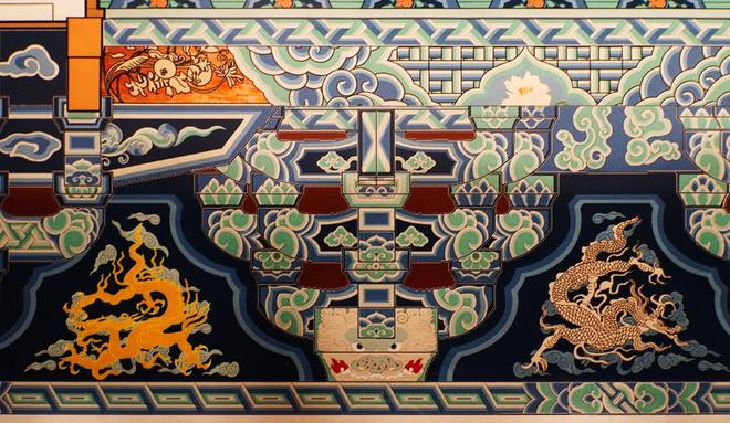 和玺彩画是清代登记最高的彩画类别,画面主要轮廓线呈横置W造型,主题多为龙凤纹,轮廓大线采用沥粉贴金工艺。“和玺”是民国对“合细”的雅称,原指清工部《工程做法》中“合细伍墨金云龙凤沥粉方心青绿地仗上五彩”,表示把最精细的纹饰聚集起来。