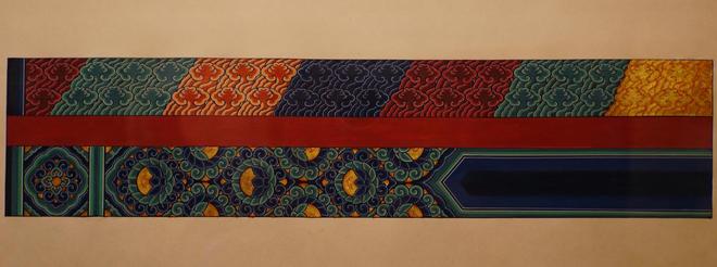 故宫博物院不仅是明清官式建筑彩画的宝库,更是中国古代建筑彩画艺术延绵千年、生生不息的历史见证。永寿宫展厅的“彩画千年——中国官式彩画传承与创新展”在前殿的“守正”板块遴选了43件自隋代至清代的中国官式建筑彩画代表性作品的临本和彩画小样,以时代为主线,从构图、纹饰、色彩、工艺等方面勾勒出中国官式彩画发展演变的历史脉络,让观众感受千年彩画艺术的独特魅力。